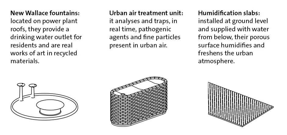 Paved pedestrian streets have widened; they rub shoulders with bike paths and tram lines. Electric vehicles and electric rickshaws blossom. A new type of street furniture has emerged. It improves sensory comfort in the city. Sources of white noise, dimmable and tonal lighting, wave reducer, heating surfaces, air purifiers and urban cooling systems join the city ecosystem.