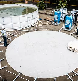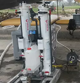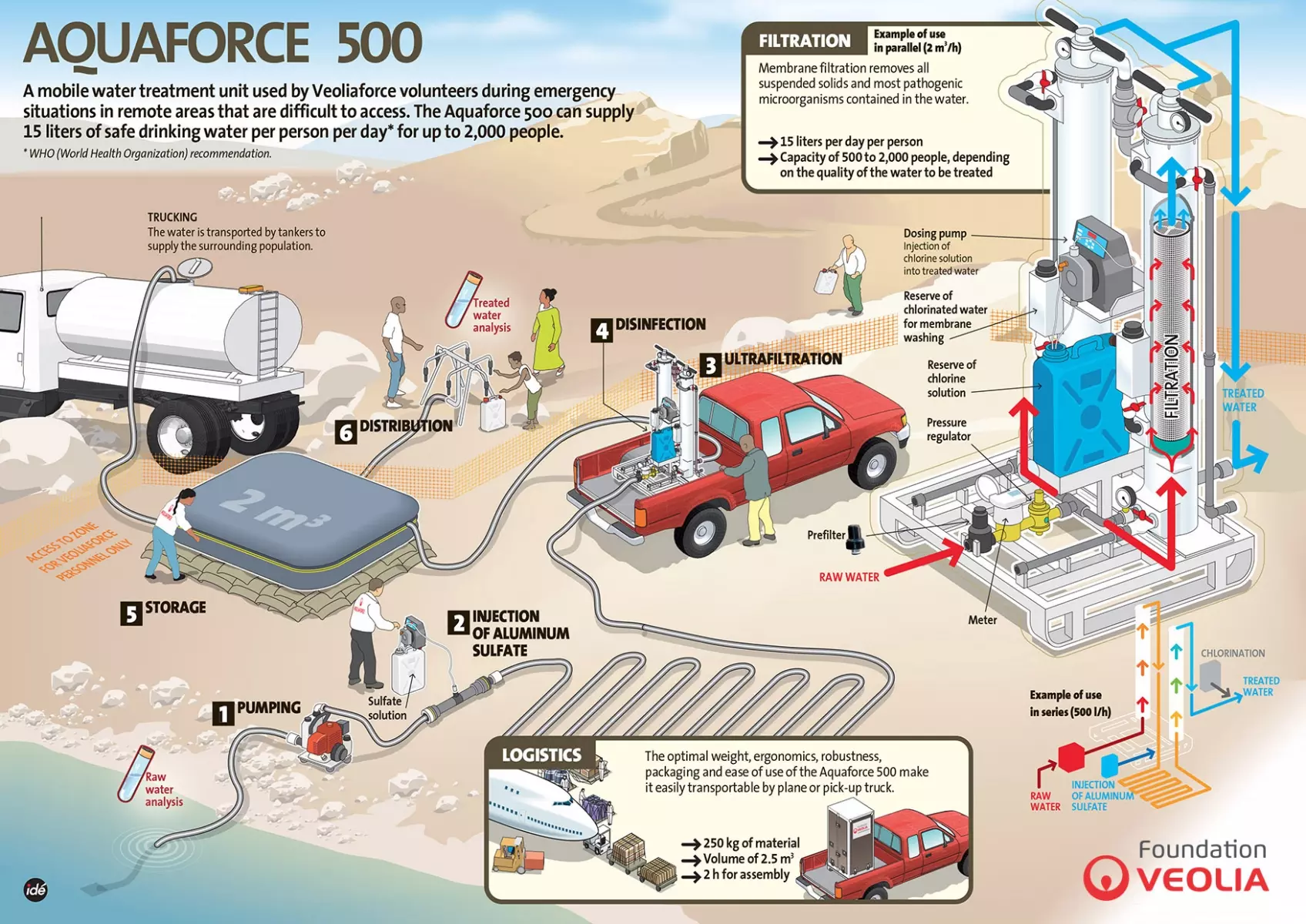 Aquaforce 500 is a mobile water treatment unit designed for humanitarian emergencies. Lighter and easier to handle than the Aquaforce 5000, it can be easily transported by pick-up and by air. The Aquaforce 500 is equipped with ultrafiltration technology. It is able to produce 15 litres of drinking water per person per day, to a population of around 2,000 people. It has been deployed by the Veoliaforce teams since 2012, in order to quickly restore access to water for disaster-stricken populations and thereby control the development of epidemics.
