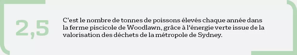Ici, le méthane issu des ordures des habitants de Sydney et récupéré par un bioréacteur, permet de produire de l’énergie verte pour 2 500 foyers de la région, et de chauffer les bassins d’une ferme d’élevage de barramundis, une espèce qui évolue dans une eau à 28°C très prisée sur le marché de la restauration de Canberra.