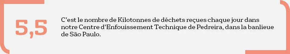 Grâce au Centre d’Enfouissement Technique de Pedreira, Veolia traite au quotidien 5 500 tonnes de déchets solides provenant à 60 % de Sao Paulo, à 25 % des entreprises industrielles et tertiaires de la région et à 15 % des autres villes de l’agglomération.