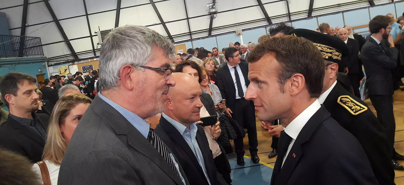 Dans le gymnase de la ville de Trèbes, Pierre Lompech, Directeur du Territoire Aude chez Veolia et ses deux collaborateurs Jean-Paul Tabarly et Gérard Gurizan, ont pu serrer la main du chef de l’Etat qui les a remerciés personnellement pour le travail accompli :
