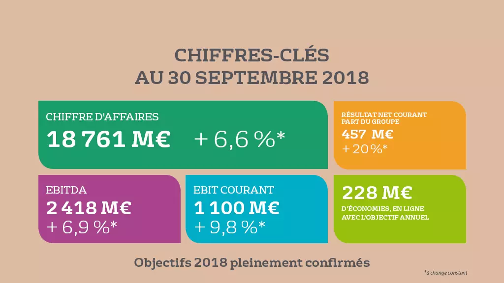 L’EBIT courant est en hausse de 9,8% à change constant. Il s’élève à 1 100 M€ au 30 septembre 2018, contre 1 024 M€ au 30 septembre 2017.