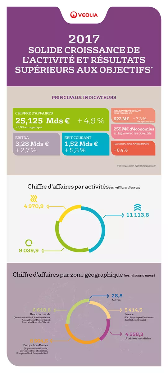 En 2017, Veolia a réalisé un chiffre d’affaires de 25 125 M€, en croissance de 4,9%[1] et +3,5% en organique. Le quatrième trimestre a démontré la poursuite du dynamisme commercial avec une accélération de la croissance du chiffre d’affaires (+6,3%[1]).