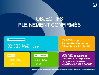 - Performance opérationnelle solide avec une croissance de l’EBITDA de +5,4 %(2) à 5 080 M€, soutenue par la croissance du chiffre d’affaires, l'efficacité opérationnelle et les synergies en ligne avec les objectifs.